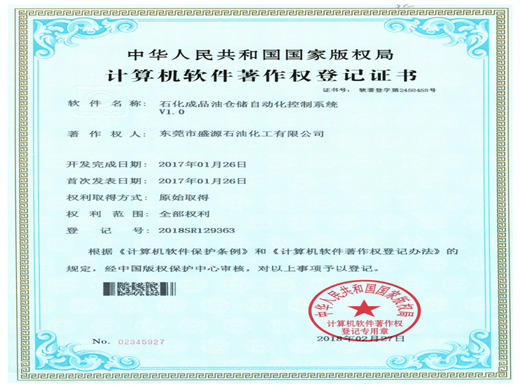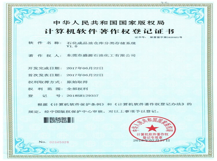 石化成品油分類存儲(chǔ)系統(tǒng)著作權(quán)登記證書Click for larger image