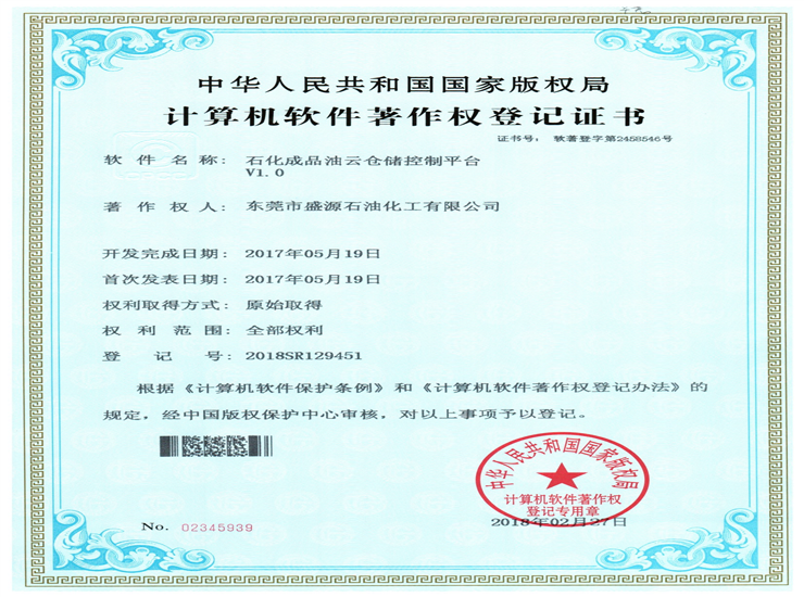 石化成品油倉(cāng)儲(chǔ)云控制平臺(tái)著作權(quán)登記證書Click for larger image