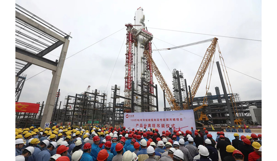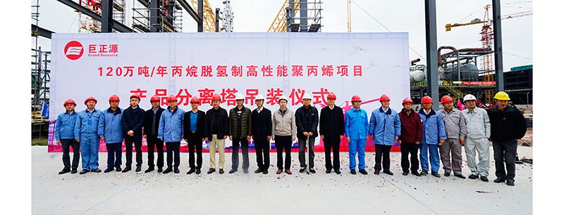 12月12日上午,巨正源公司120萬噸/年丙烷脫氫制高性能聚丙烯項目(以下簡稱“丙烷脫氫項目”)產(chǎn)品分離塔吊裝儀式在東莞市沙田鎮(zhèn)立沙島舉行。最大直徑12米、高128米,總重量約3050噸的“巨無霸”——產(chǎn)品分離塔整體一次成功吊裝就位,創(chuàng)造了國內(nèi)乃至亞洲大型設備吊裝新紀錄,同時也標志著丙烷脫氫項目第一階段工程建設全面進入沖刺階段。