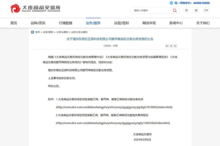 2月8日,大連商品交易所官網(wǎng)發(fā)布公告,增加?xùn)|莞巨正源科技有限公司為聚丙烯期貨交割業(yè)務(wù)“指定廠(chǎng)庫(kù)”。這是繼“巨正源”牌聚丙烯成為期貨注冊(cè)品牌、免檢品牌后取得的又一重要成果。