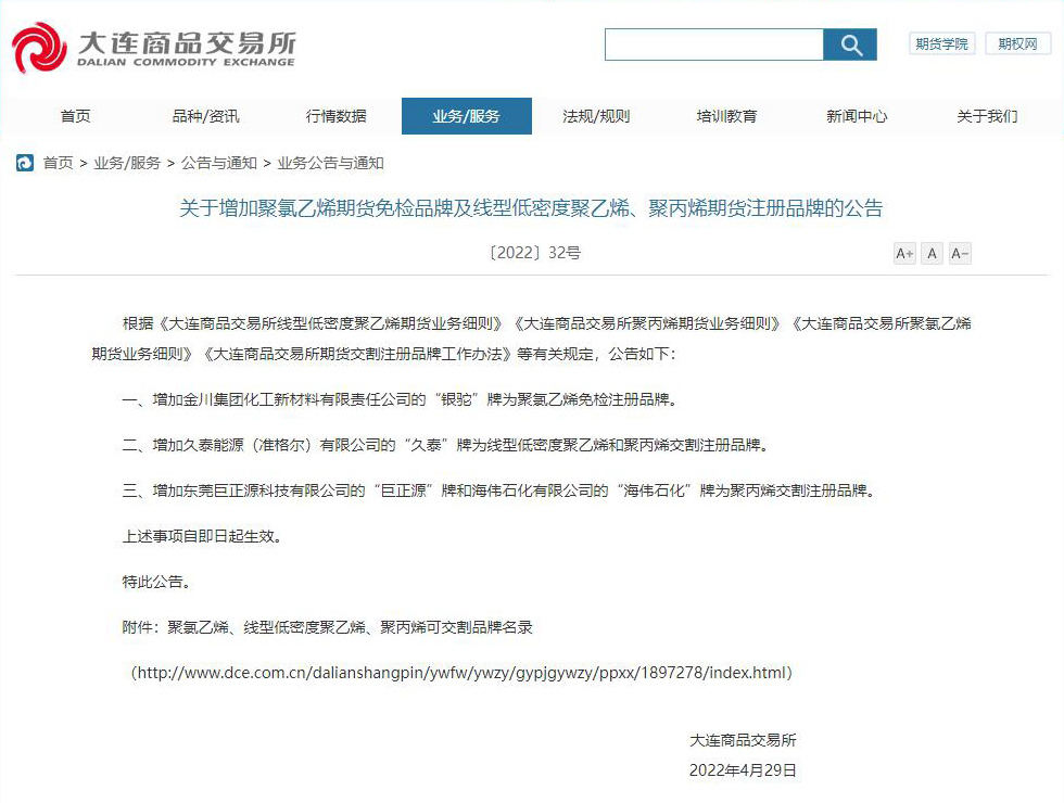 4月29日,大連商品交易所官網(wǎng)發(fā)布公告,增加?xùn)|莞巨正源科技有限公司的“巨正源”牌聚丙烯為聚丙烯期貨交割注冊品牌。
