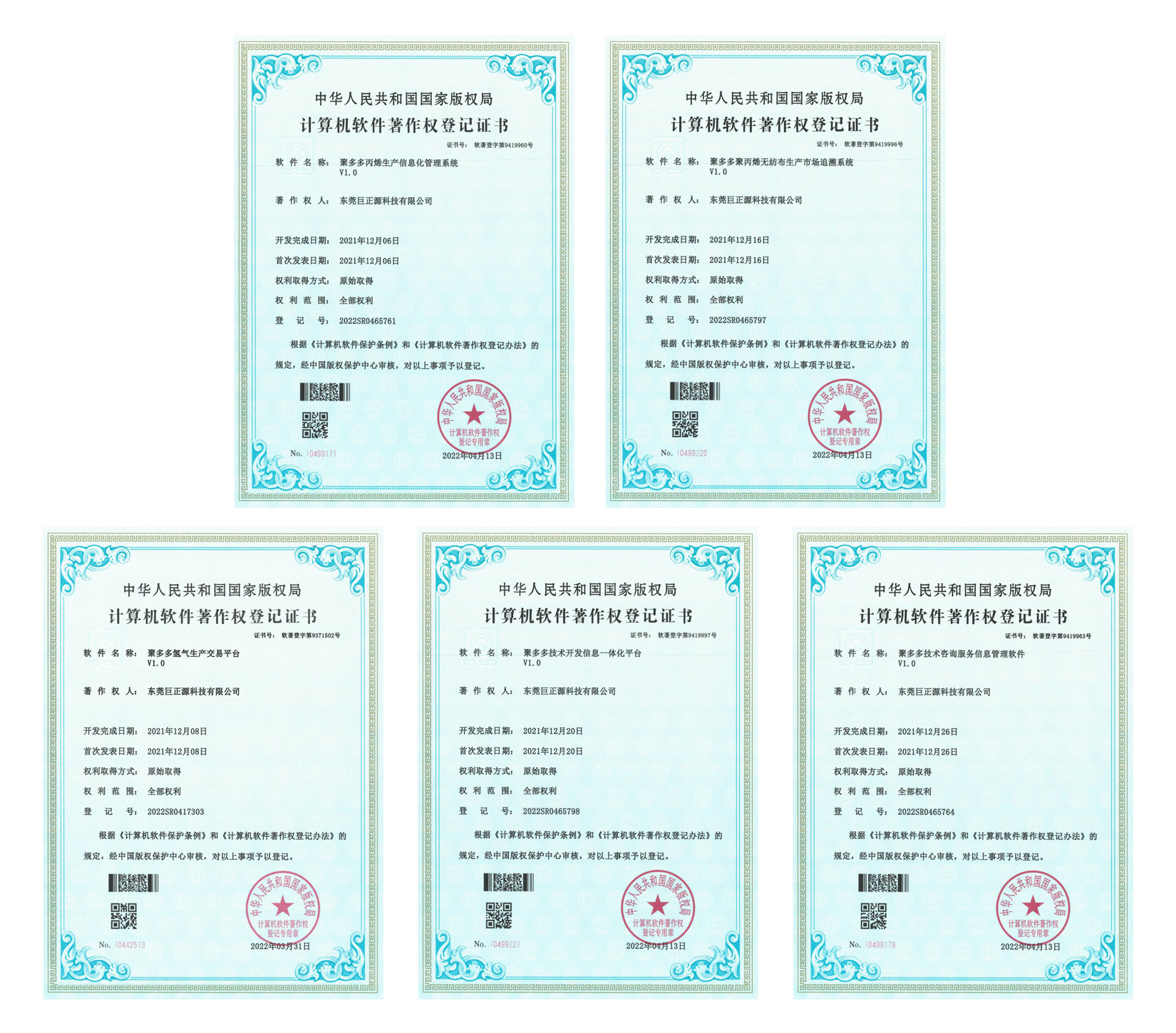 此次獲得軟件著作權證書包括:《聚多多氫氣生產交易平臺V1.0》、《聚多多丙烯生產信息化管理系統V1.0》、《聚多多技術咨詢服務信息管理軟件V1.0》、《聚多多聚丙烯無紡布生產市場追溯系統V1.0》、《聚多多技術開發信息一體化平臺V1.0》。這些都是巨正源公司圍繞以“技術創新”和“產品研發”通過自主研發推進自動化生產、智能化管理所取得的知識產權成果,并全部應用于公司生產信息系統中,為聚多多電商平臺技術開發、服務管理、實現創新平臺線上銷售模式提供信息化數字基礎。