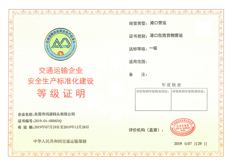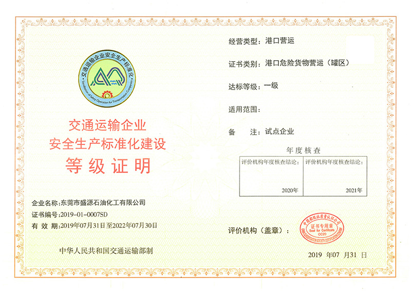 日前,巨正源所屬盛源石化、鴻源碼頭正式獲得由國(guó)家交通運(yùn)輸部頒發(fā)的“交通運(yùn)輸企業(yè)安全生產(chǎn)標(biāo)準(zhǔn)化建設(shè)一級(jí)達(dá)標(biāo)企業(yè)證書”,這標(biāo)志著盛源石化、鴻源碼頭安全生產(chǎn)管理邁上標(biāo)準(zhǔn)化、規(guī)范化的新臺(tái)階。
